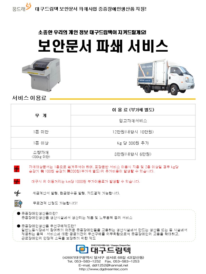 대구드림텍 보안문서 파쇄서비스를 이용해 주시는 모든 기관 및 고객 여러분께 감사드립니다. 2026년도 보안문서 파쇄서비스 이용료를 아래와 같이 안내드립니다.